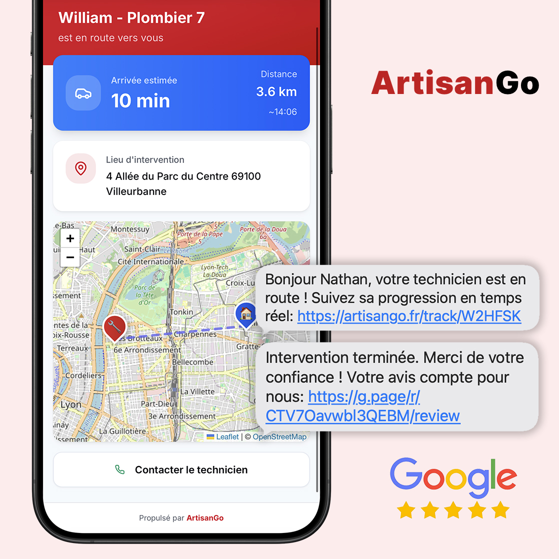 À la fin de chaque intervention, un SMS avec votre lien Google Avis est envoyé automatiquement au client.